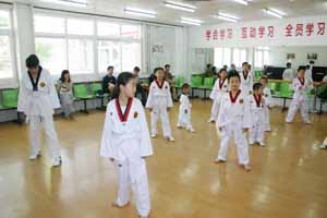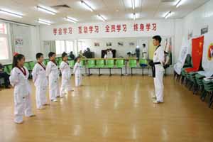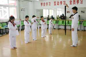 一、礼仪及精神气质的培养:将跆拳道精神“礼仪、廉耻、忍让、克己、百折不屈”贯彻在教学中。