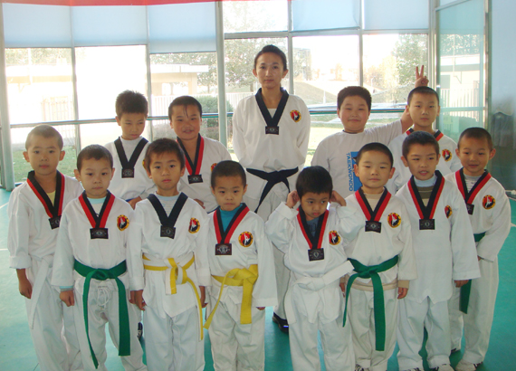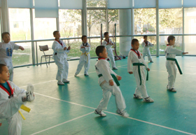 二、跆拳道技术:针对儿童特点特别编制课程:身体柔韧性训练、身体协调性训练、腿法基本功。